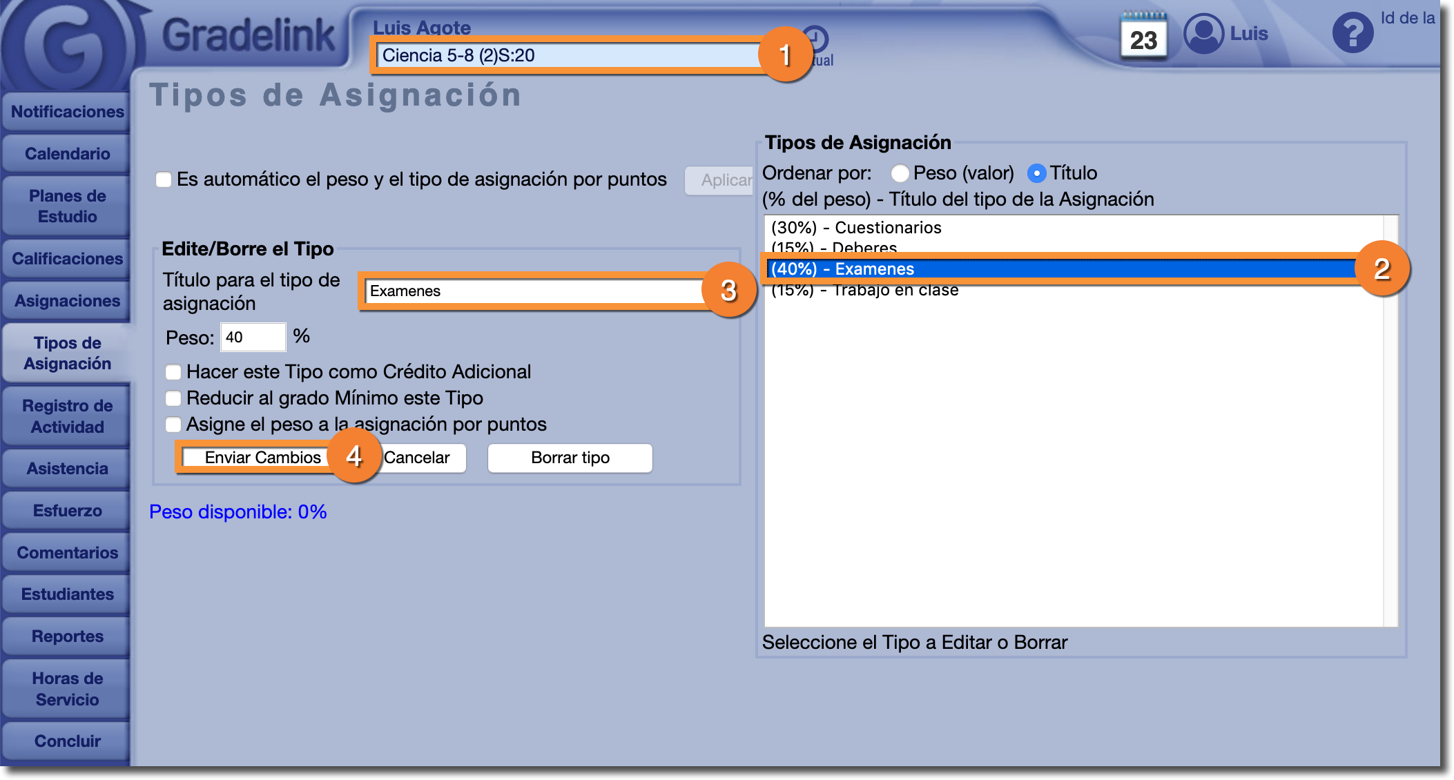 Para solucionar este problema, el maestro que configuró los tipos de asignación deberá asegurarse de usar el mismo nombre exacto para cada tipo en cada término.
