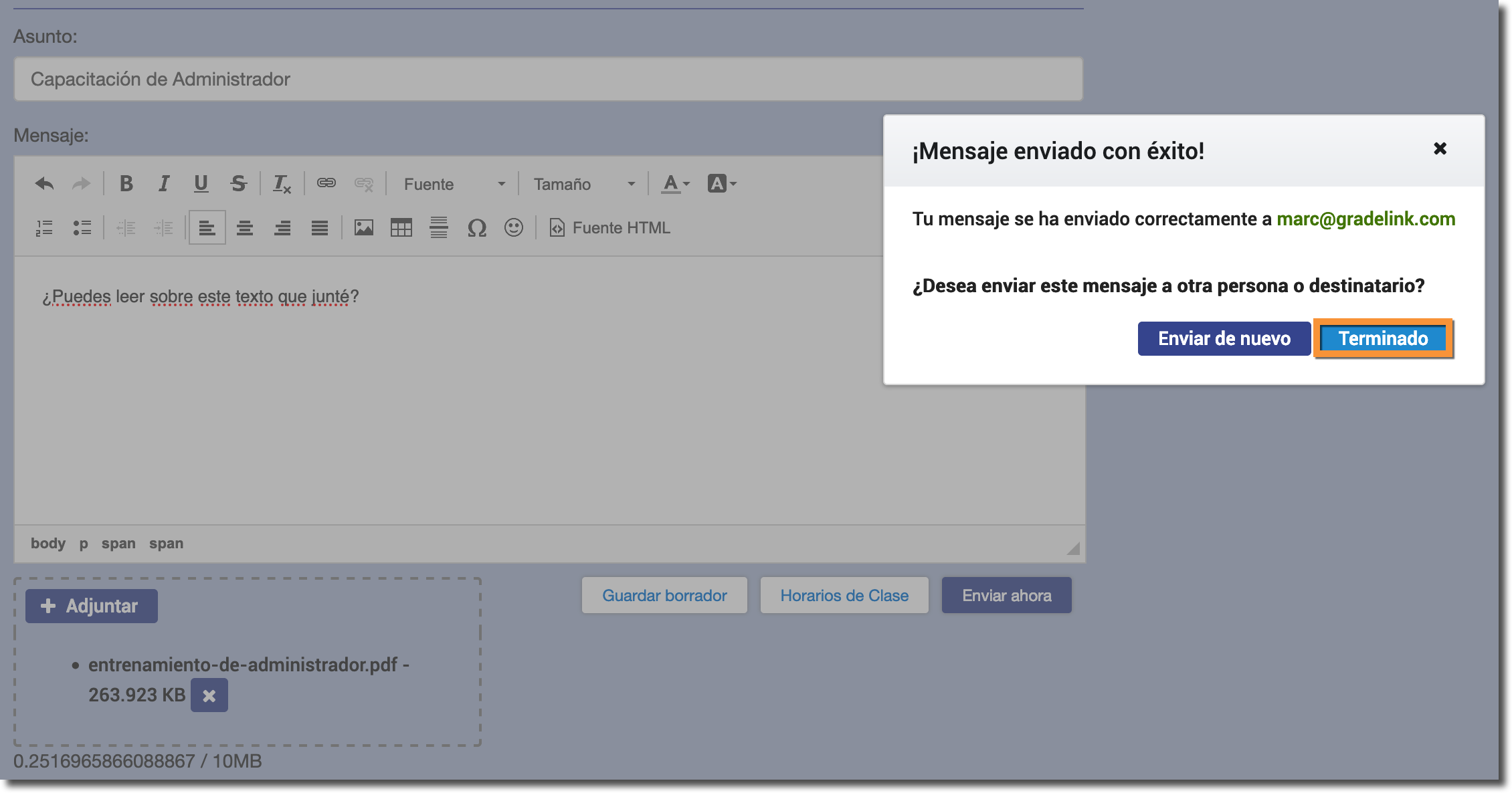 Nota: Cuando cargue un archivo adjunto, déle tiempo a que se cargue completamente, luego envíelo.