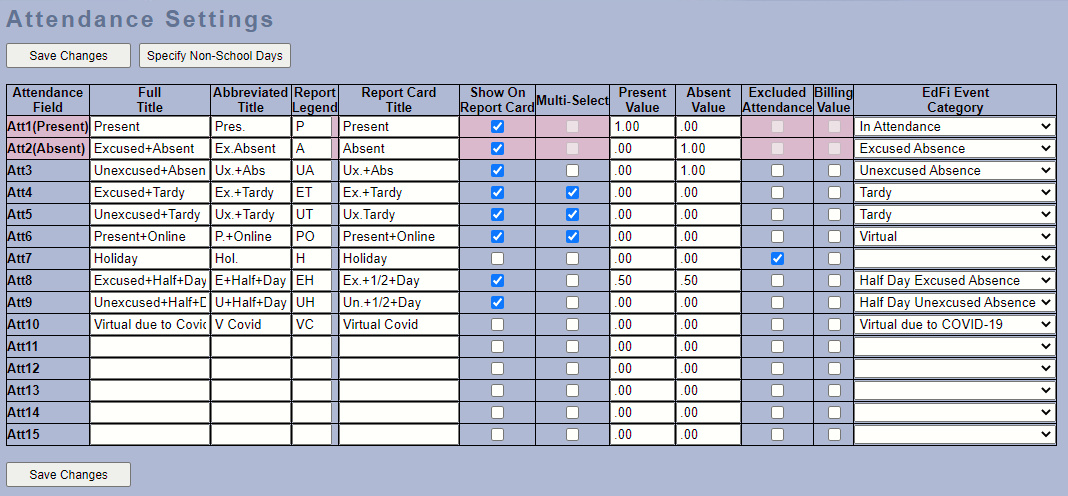 Note: Data Exchange requires that both "Present" and "Absent" calendar events (Att1 and Att2 in the screenshot above) are assigned an Ed-Fi Event Category. All other calendar events can be left blank.