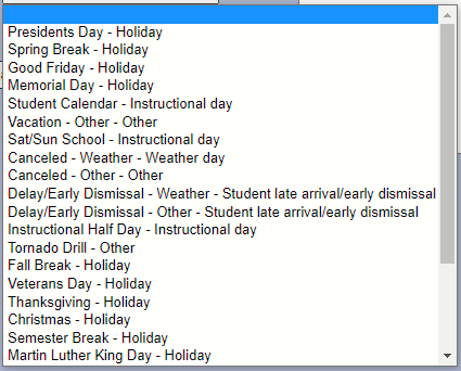 Then, all you need to do is select an existing Non-School Day from the list on the right and assign a DOE Calendar Event too it using the corresponding dropdown menu on the left. The DOE Calendar Events menu includes a large number of different events to choose from, so pick the ones that best correspond to the Non-School Days you've configured in Gradelink. If none of the values in the dropdown menu match, then select "Custom Event" instead (it's at the bottom of the list).