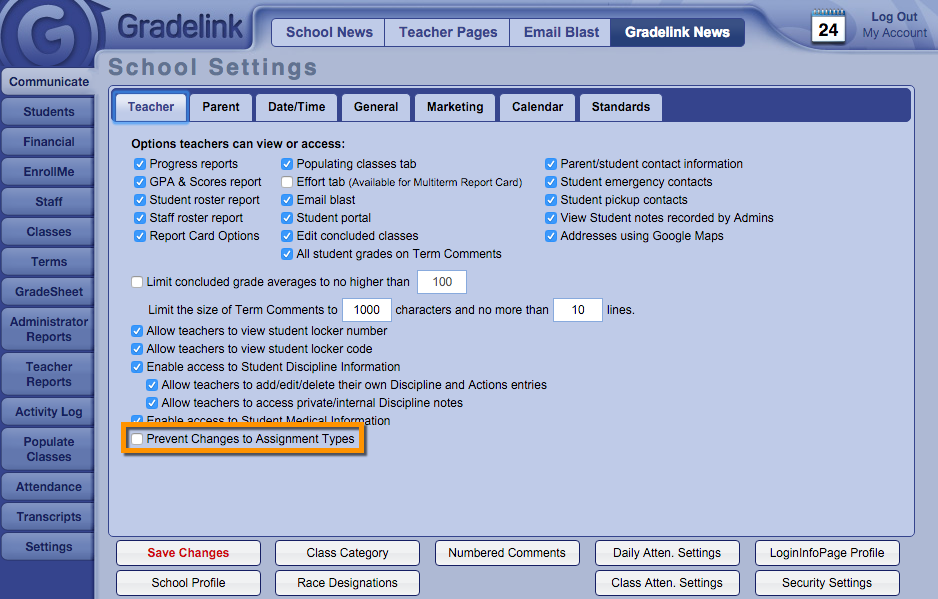Gradelink gives Administrators the ability to prevent teachers from making changes to their assignment types.