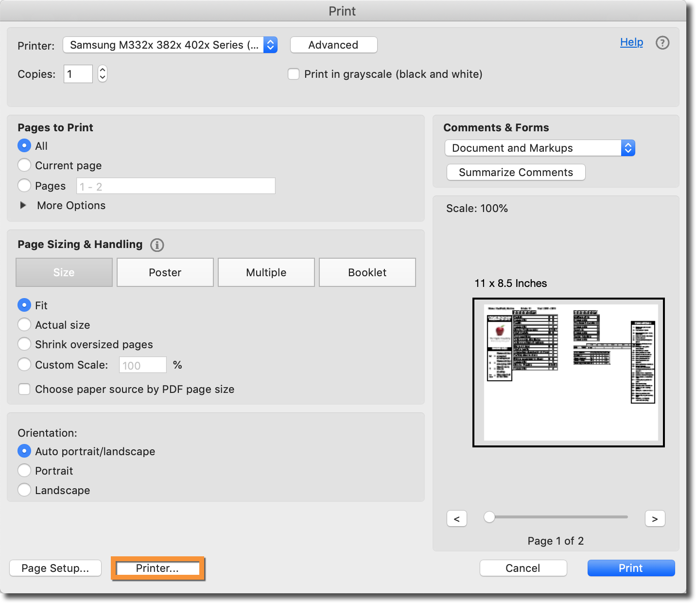 Making changes to your printer configuration requires slightly different steps depending on which Operating System you are using (Windows or macOS) as well as which Browser or which PDF Reader you're using.