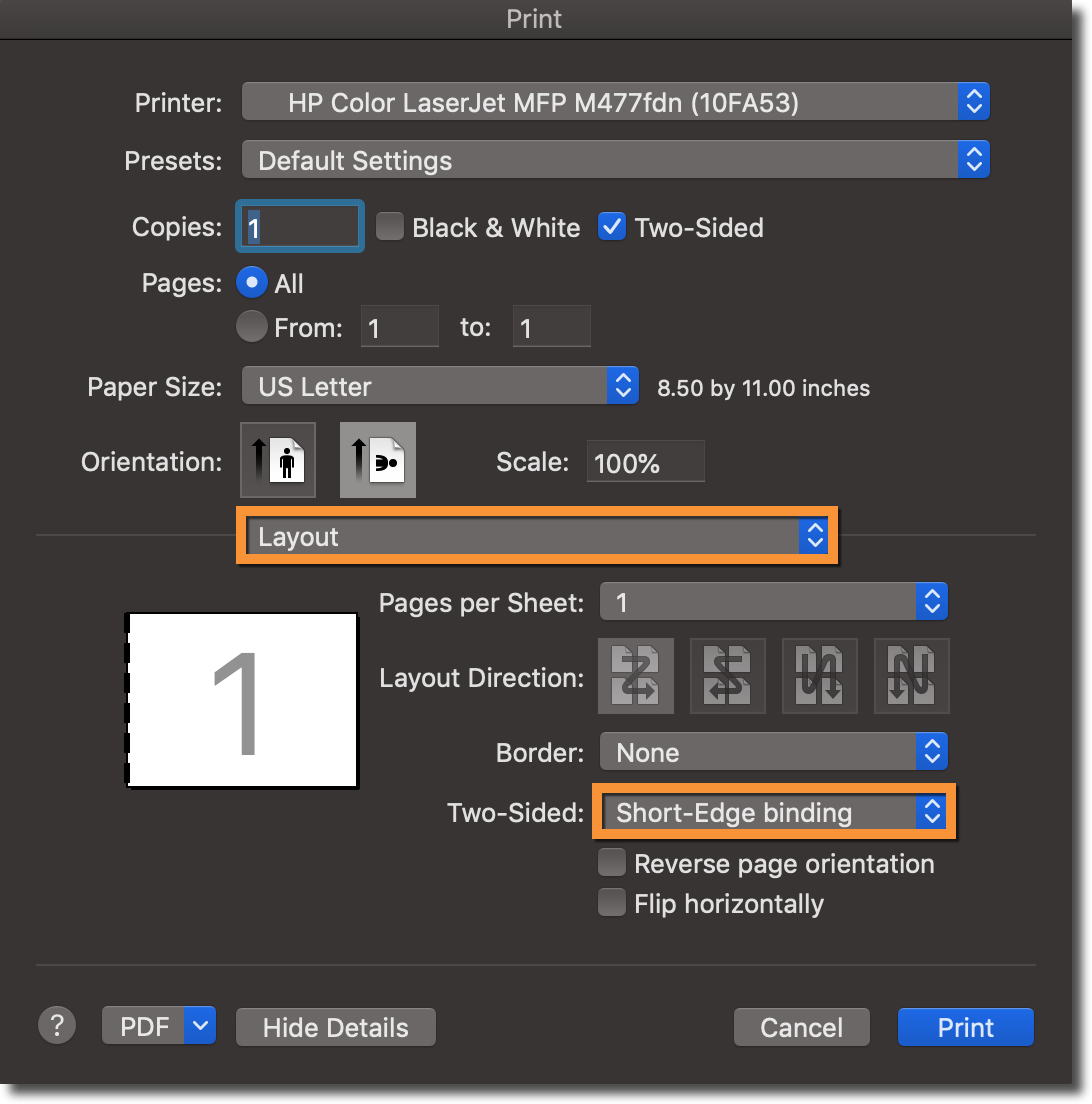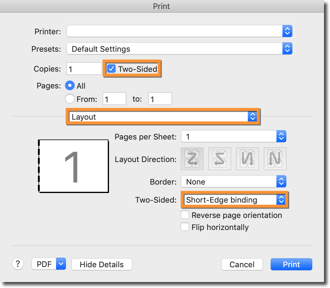 In the window that appears, make sure that "Two-Sided" is checked. Then select the Layout menu and make sure that the "Two-Sided" setting is set to Short-Edge binding.