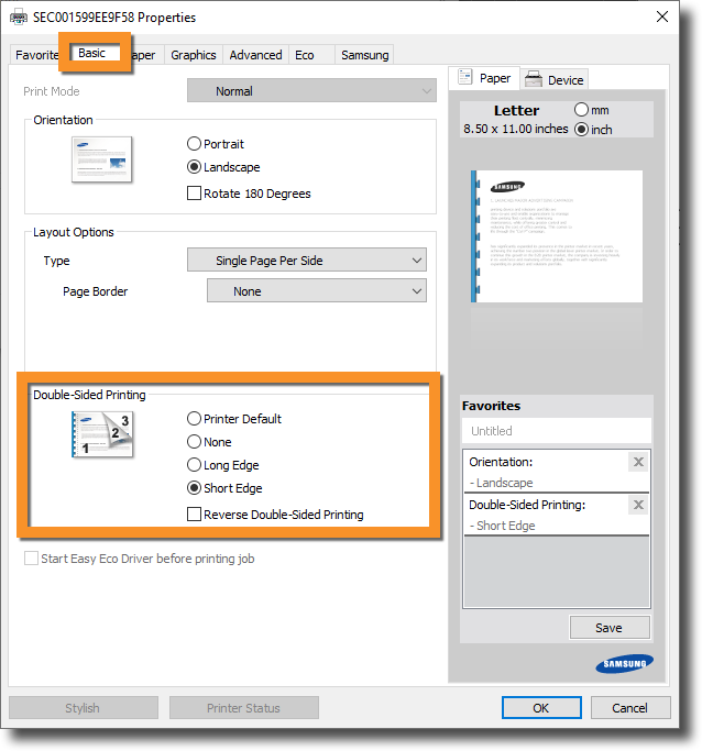 Finally, click on the Basic tab and then make sure that "Short Edge" is selected in the Double-Sided Printing menu.