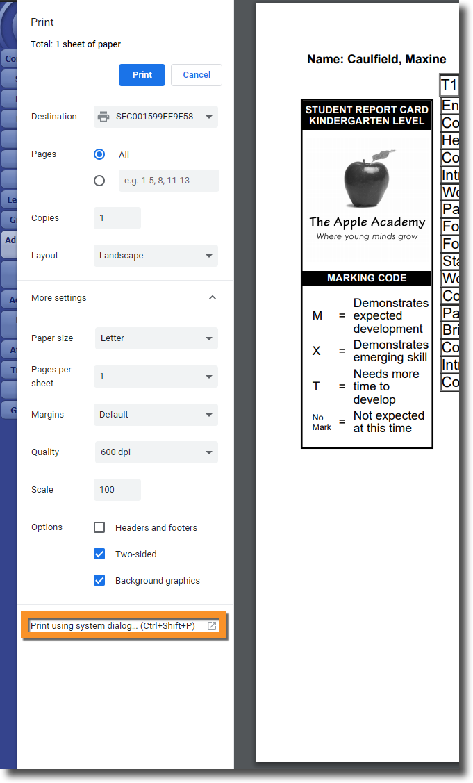 To print a two-sided report card in Chrome, you will need to first open the Print menu and then select Print using system dialogue...