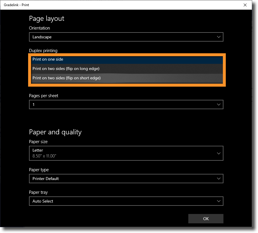 Note: Not all printers support two-sided printing! If your printer does not support two-sided printing, even if you follow the steps listed here your report cards may not print correctly.