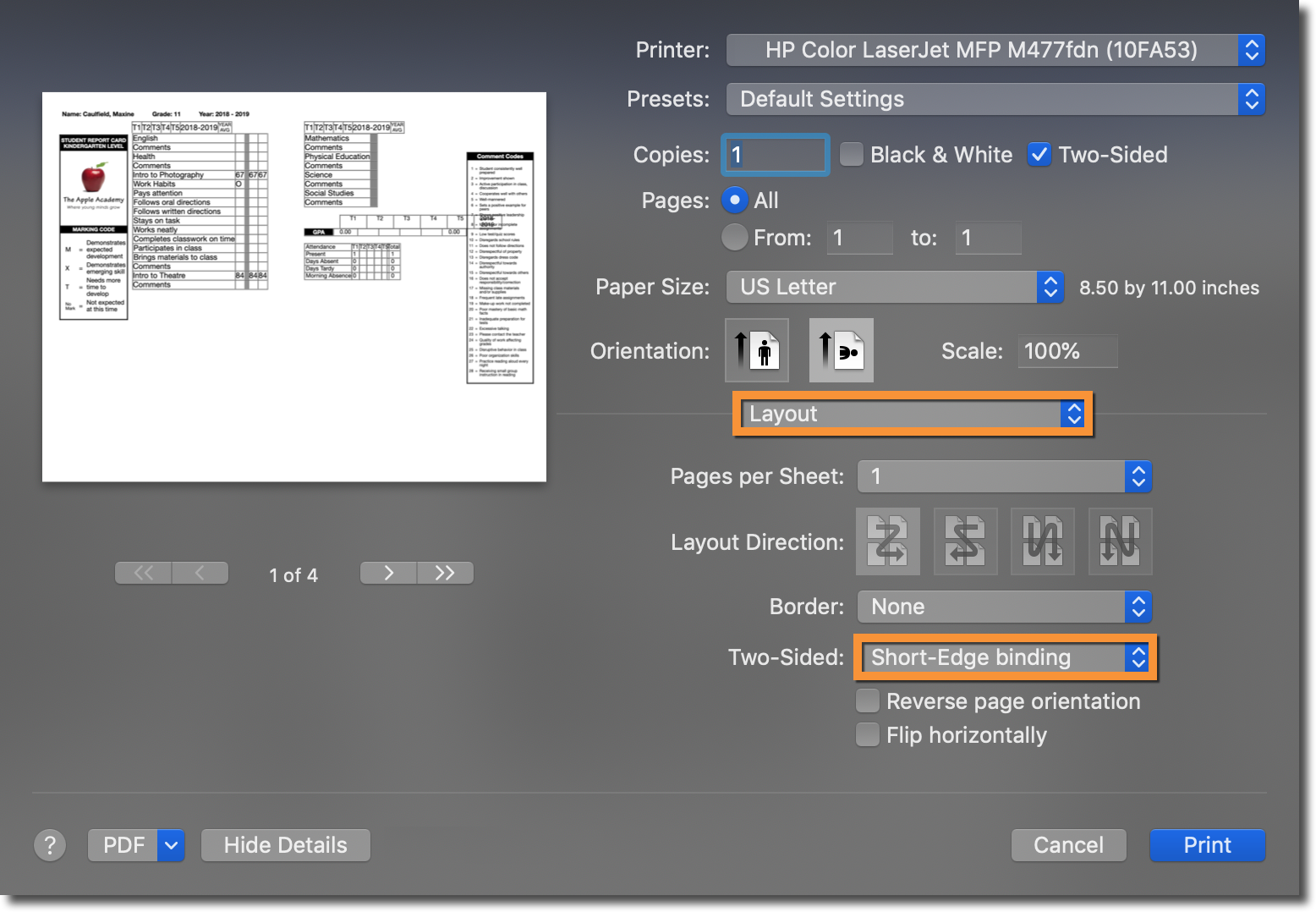 Printing a two-sided report card through your browser on macOS