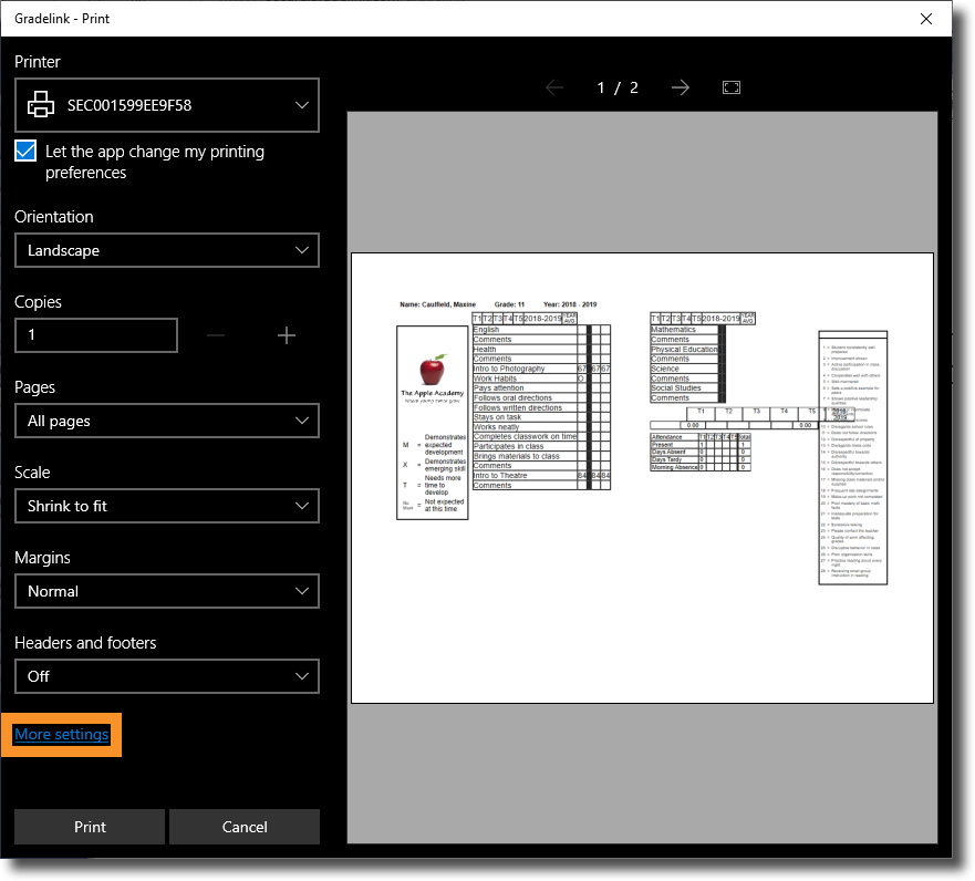 To print a two-sided report card in Edge, you will need to first open the Print menu and then select More settings near the bottom of the page.