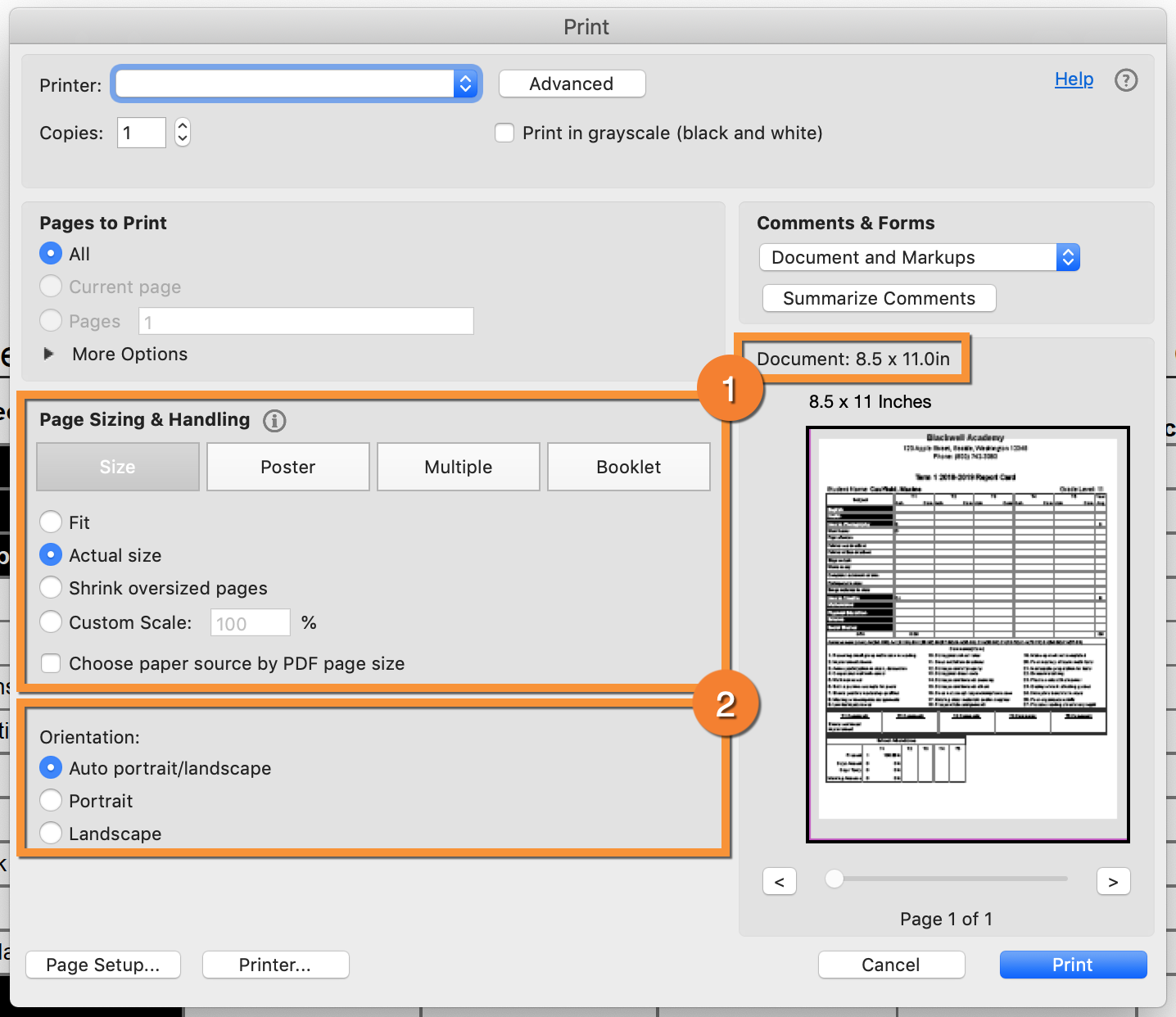 1. Confirm Paper Size and Orientation - Paper Size and Orientation should default to the correct values, but just in case they don't it is helpful to double-check these fields. If you aren't sure what the correct paper size and orientation are for your report card, please click here.