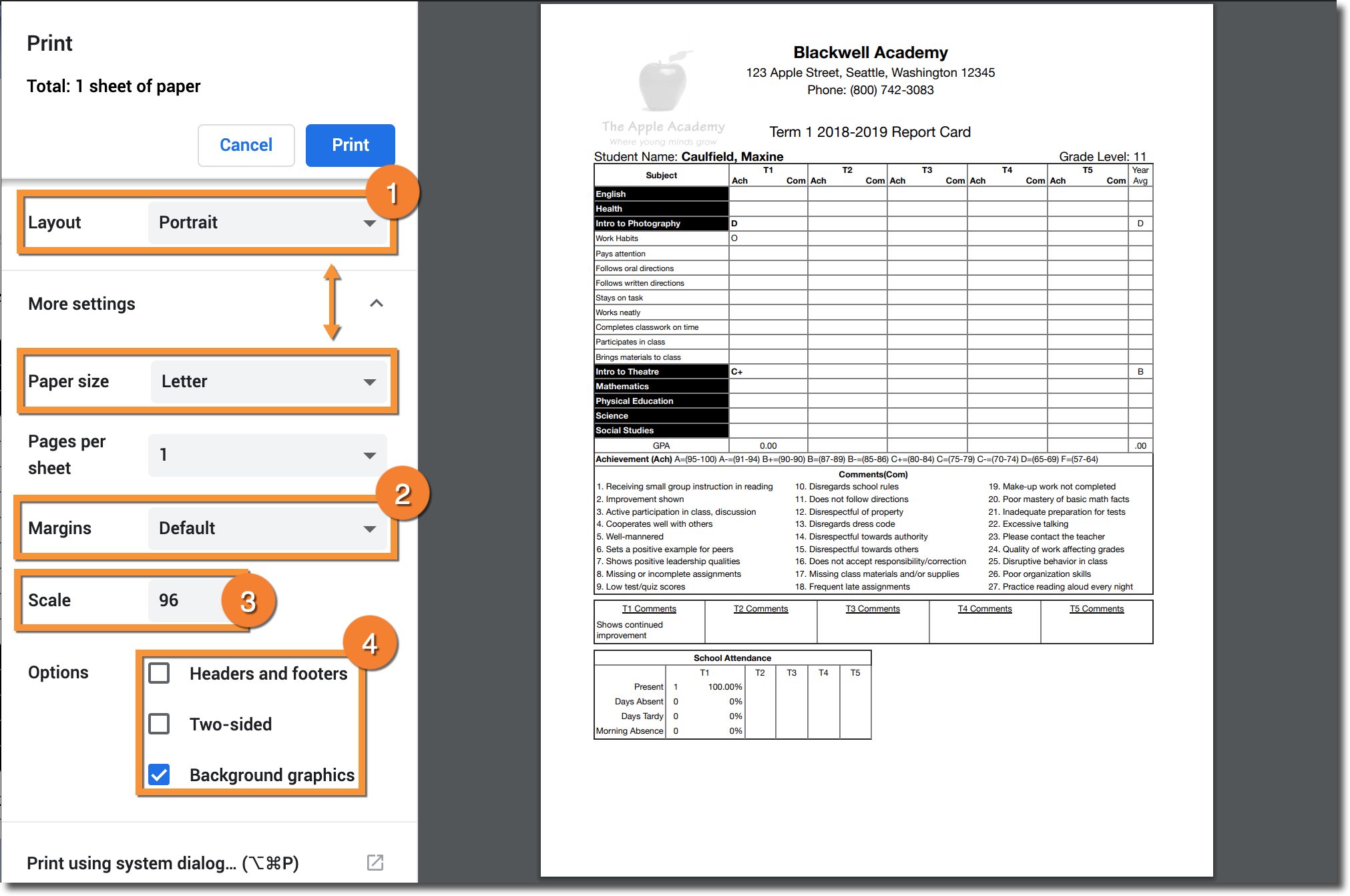 Printing a Report Card in Google Chrome