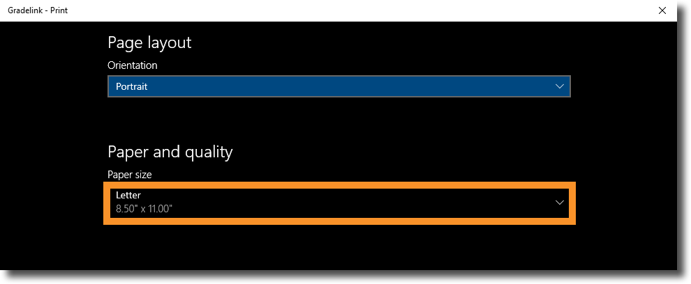 1. Confirm Paper Size and Orientation - Paper Size and Orientation should default to the correct values, but just in case they don't it is helpful to double-check these fields. If you aren't sure what the correct paper size and orientation are for your report card, please click here.