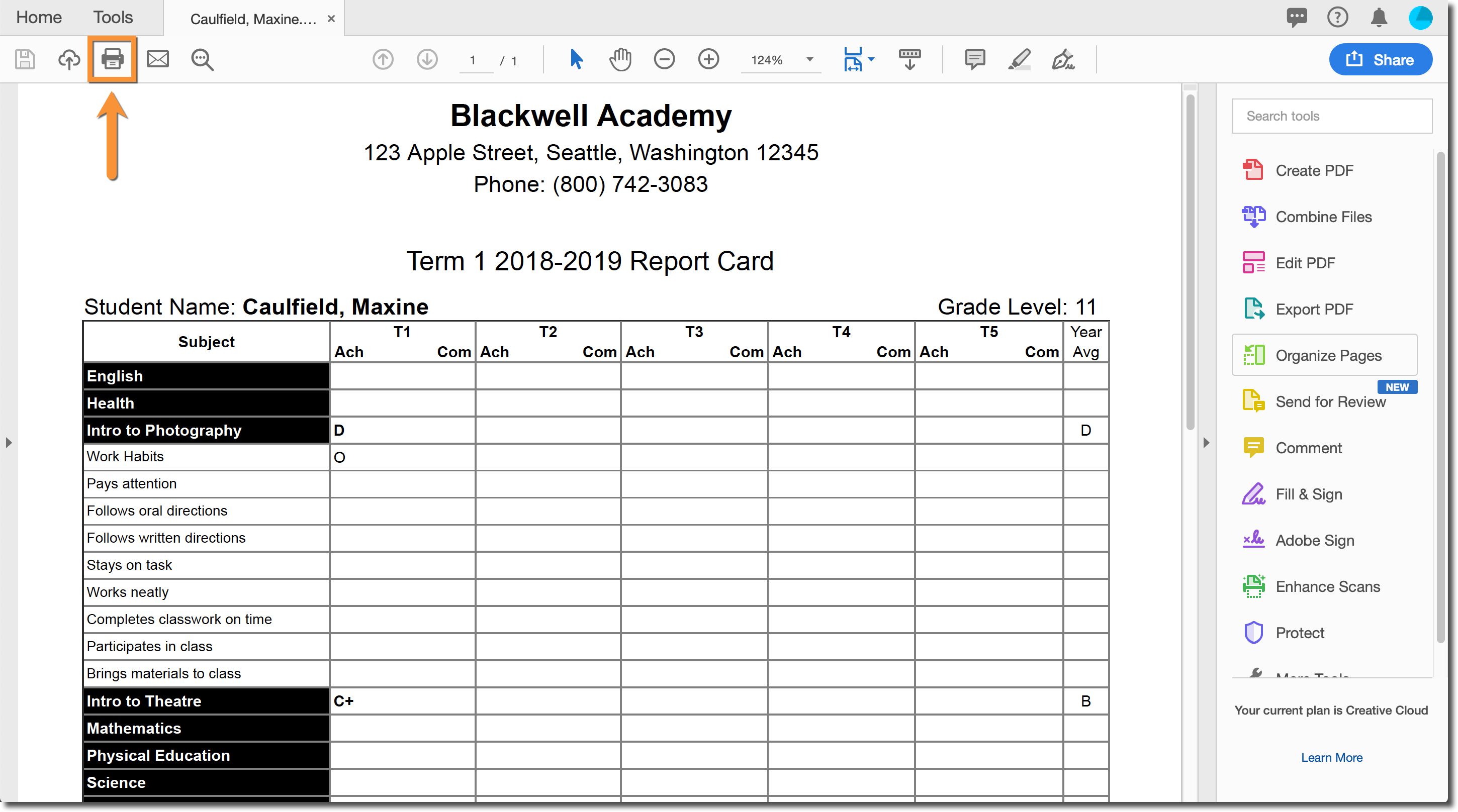 After downloading the PDF version of the report card that you would like to print, open it in Acrobat Reader. You should see an interface similar to this:
