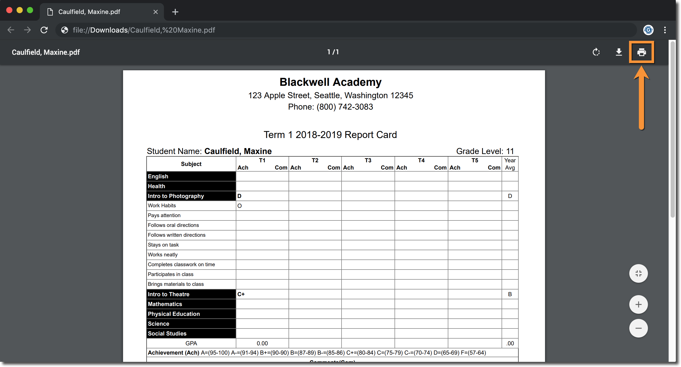 After downloading the PDF version of the report card and opening it in Google Chrome, you should see an interface like this: