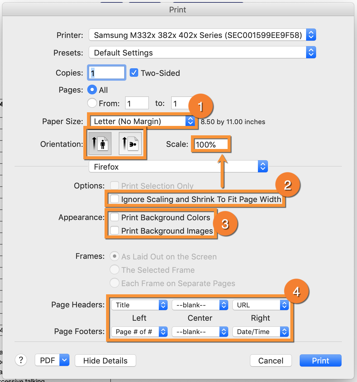 3. Enable Print backgrounds and disable Print headers and footers - Gradelink generates report cards in 'layers', and while most of the report card is on a single layer additional content such as watermarks, school logos, and certain colors are located on secondary layers. Enabling "Print backgrounds" will ensure that all of the report card shows up when printing. Occasionally, a school may want to include information in the Header or Footer, but if that's not the case we recommend turning this setting off.