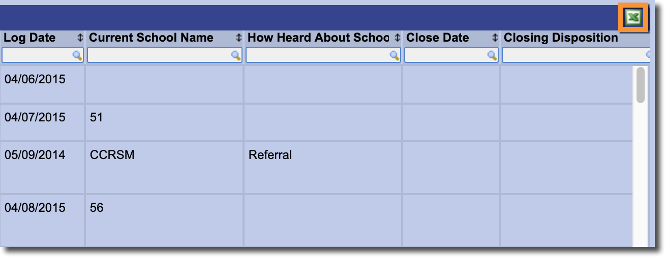 If you would like to export the list of prospect records, Gradelink allows you to download the complete list as an Excel spreadsheet by using the green X icon in the top right corner.
