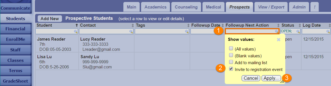 Whenever the Prospective Student Form is completed (or whenever you manually add a prospect), a new record will appear on the grid located in the Prospects tab.