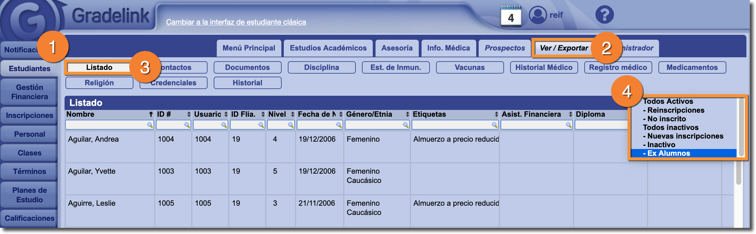 Los administradores pueden generar una lista de ex alumnos utilizando el Listado de estudiantes. De manera predeterminada, el listado mostrará a todos los estudiantes con el estado "Activo"; sin embargo, el Listado también puede mostrar estudiantes marcados como "Inactivo" o como "Ex Alumno".