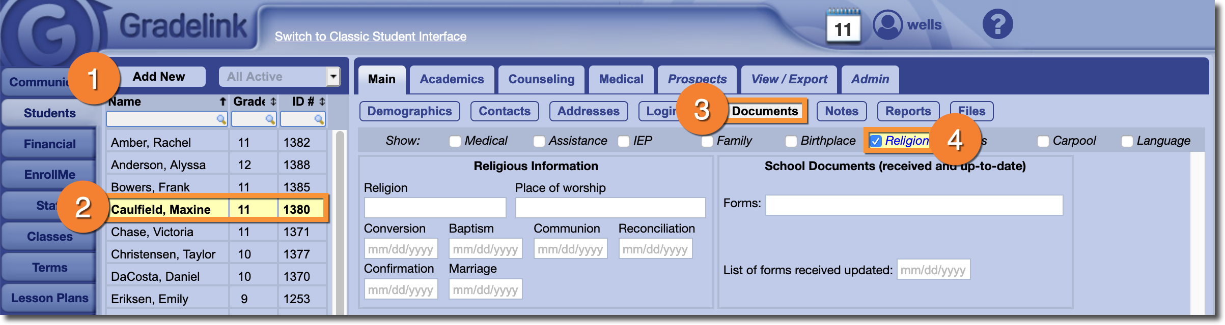 Using the Documents page, Administrators can record religious information for their students.