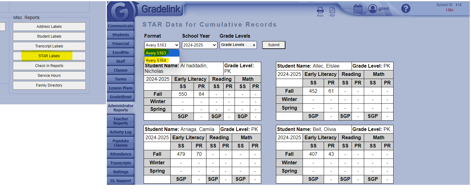 This report will be used to generate Avery Labels (5163, 5164)  for Renaissance Star Score Data.