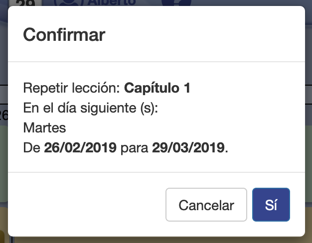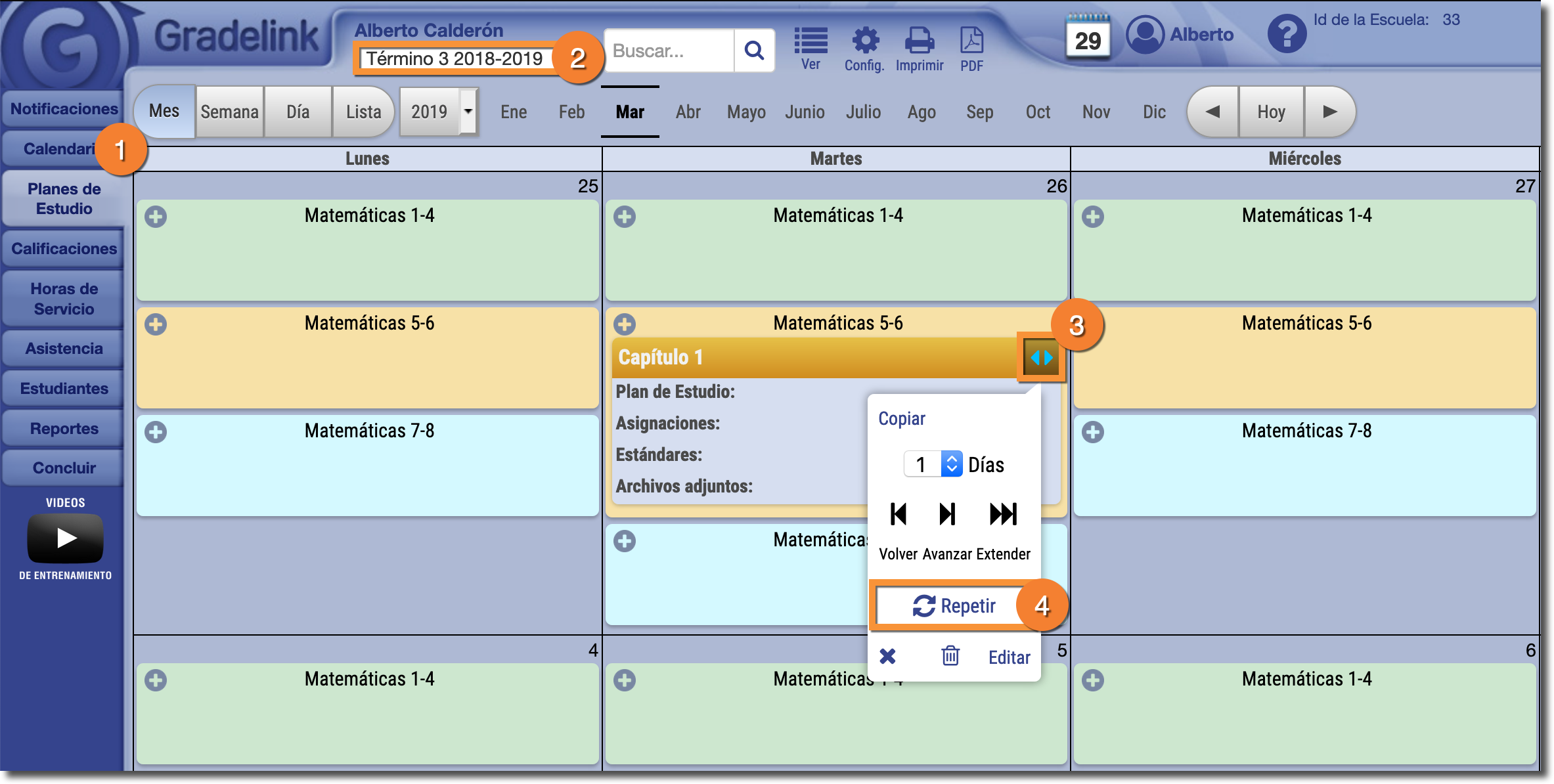 Ocasionalmente, un profesor creará un plan de estudio que desea reutilizar periódicamente. Por ejemplo, tal vez un profesor de música quiera programar prácticas dos veces por semana durante todo el curso. En este caso, intentar copiar o extender los planes iniciales sería increíblemente lento. Sin ebargo, hay una manera rápida y fácil de lograr esto: Repetir los planes de estudio.