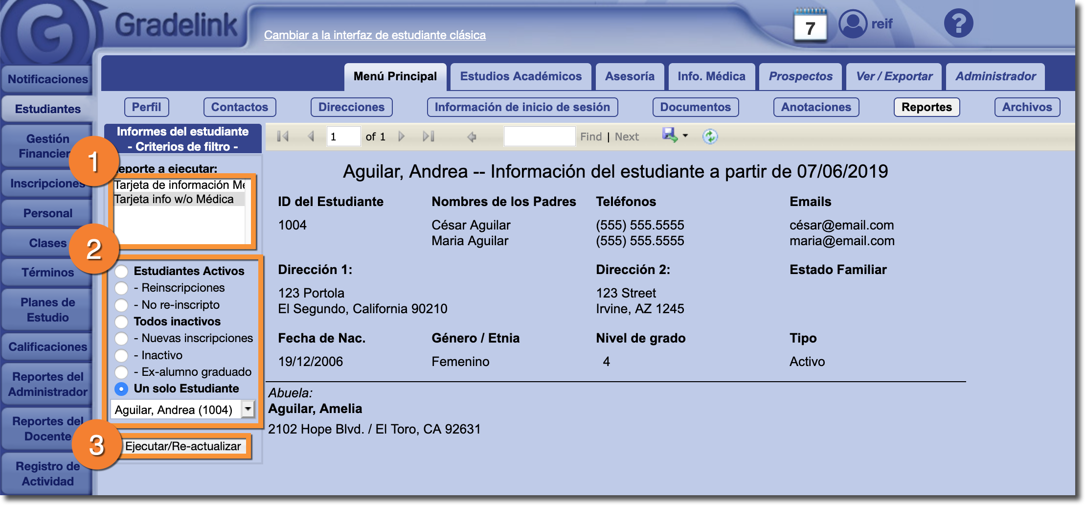 El Reporte de Información del Estudiante (también conocido como la Tarjeta de emergencia) es útil para compartir información de contacto de emergencia así como información médica del estudiante. Este reporte se puede compartir con los maestros y está disponible en línea en formato digital y en un formato imprimible.
