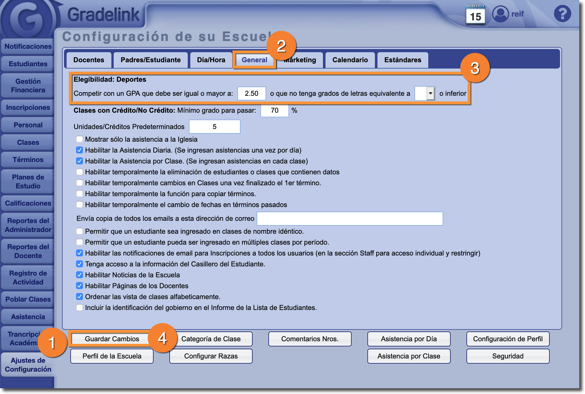 Gradelink permite a las escuelas establecer los requisitos de GPA y de calificación de la clase para los estudiantes inscritos en clases de deportes.