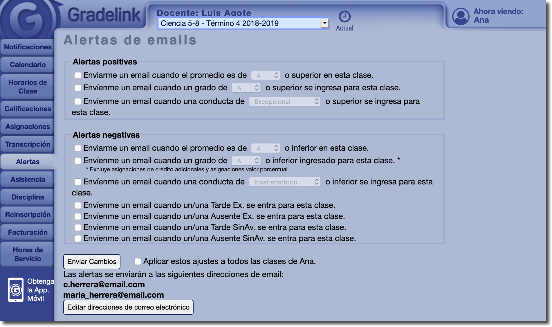 Los estudiantes y los padres pueden optar por suscribirse a alertas por correo electrónico relacionadas con las calificaciones y la asistencia. Las alertas por correo electrónico son automáticas y no requieren ningún esfuerzo adicional por parte de la escuela. Además, los estudiantes y los padres pueden actualizar y configurar alertas separadas entre sí, así como una dirección de correo electrónico separada.