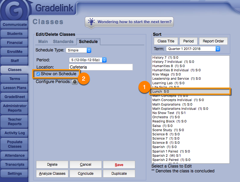 Classes like lunch, comments, work habits are usually a non-standard class. By default it will not display on the Schedule Report. To enable the class to show on the schedule: