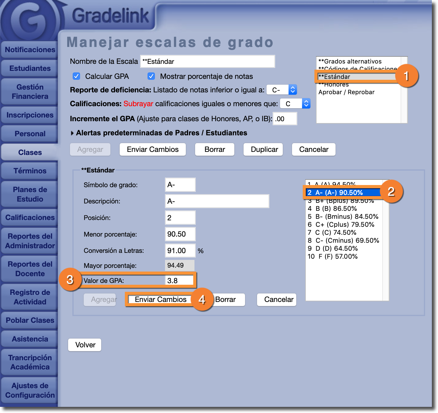 Al igual que los tipos de clase, no todas las escalas de grado calculan el GPA. De forma predeterminada, las escalas de calificación Estándar y de Honores son las únicas que lo hacen, por lo que es importante verificar dos veces qué escalas de calificación están asignadas a sus clases.