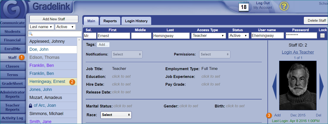 Staff Photos Staff Photos To add a staff photo: Go to the Staff tab Click on a staff member Click on the Add button Choose a file from your computer to upload