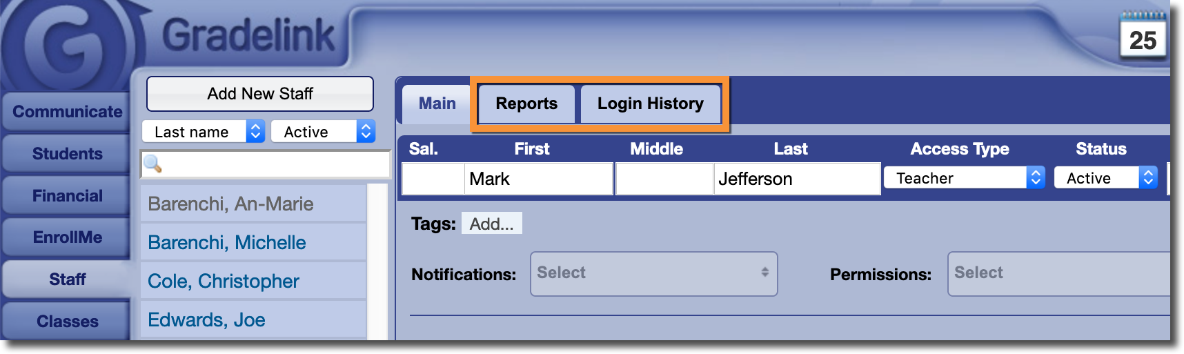 - The Login History Report, which allows you to see how often your teachers are logging in to enter grades, attendance, etc.
