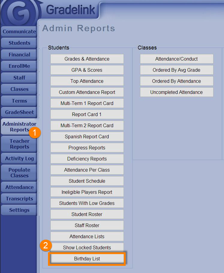 Student Birthday List Student Birthday List Students Birthday Report:1. Navigate to "Administrator Reports".2. Click on the "Birthday List".