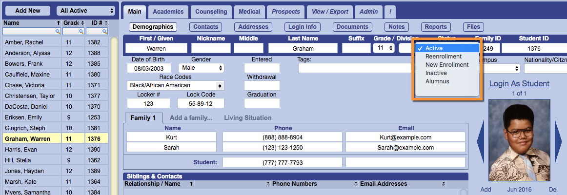 - Active: This is the general status for any student currently enrolled in your school. Students with this status can be populated into classes and receive grades. They will also have access to a live student login account.