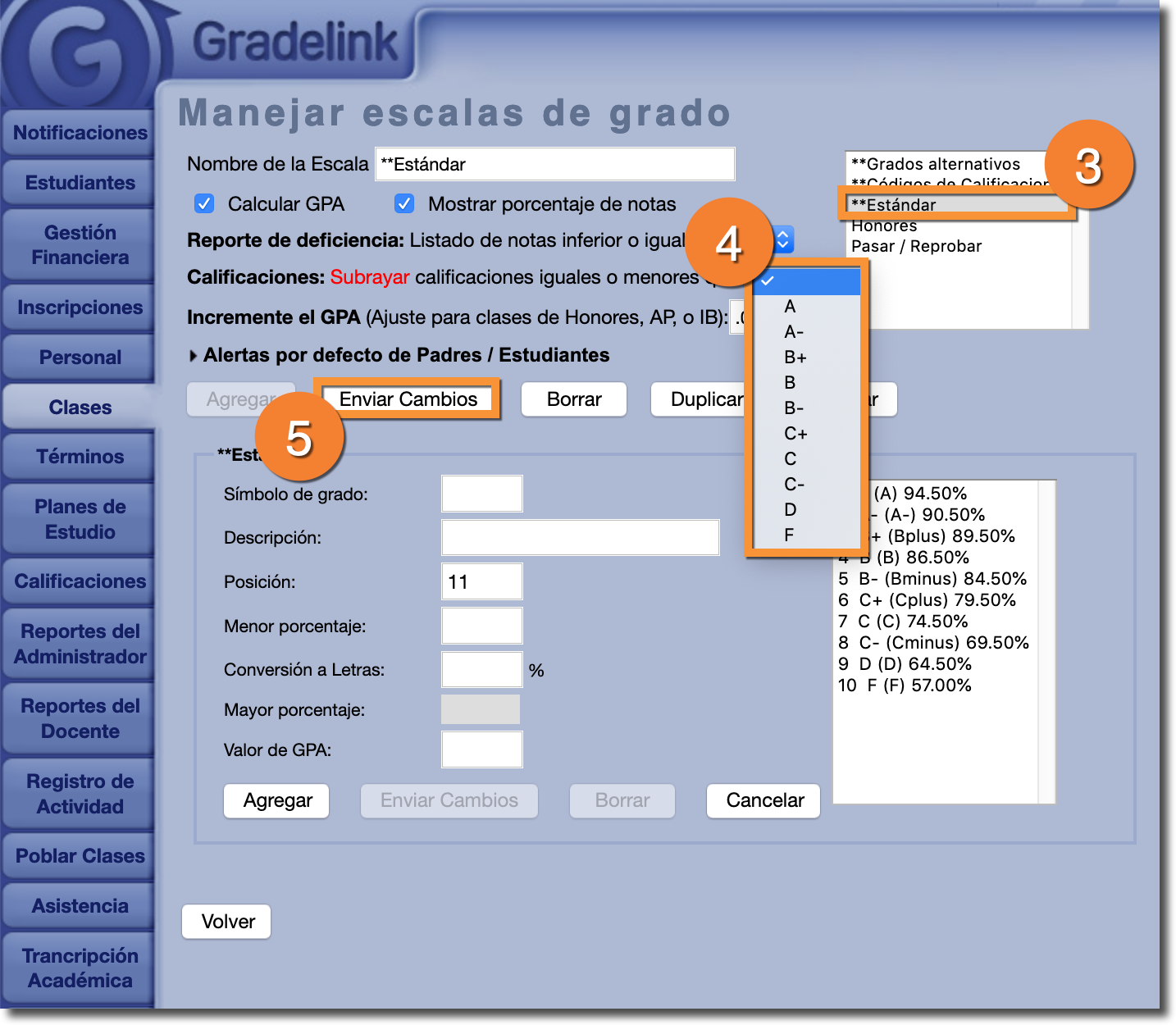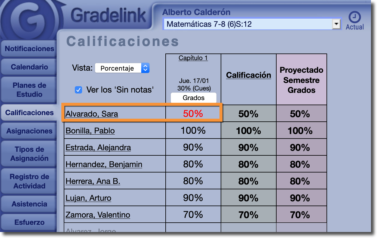 Gradelink permite a los administradores habilitar el subrayado de mala calificación, lo que hace que las calificaciones que caen por debajo de un cierto umbral aparezcan en un color diferente en la hoja de calificaciones.