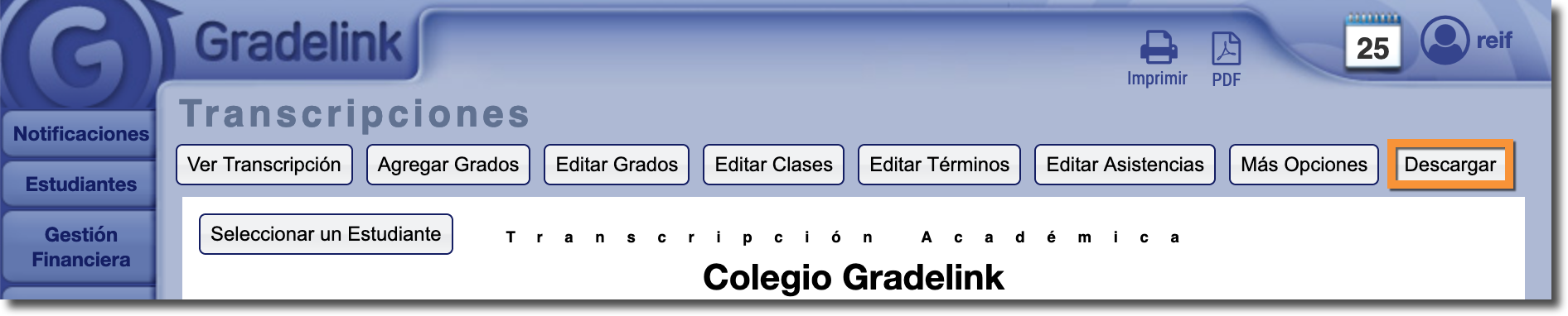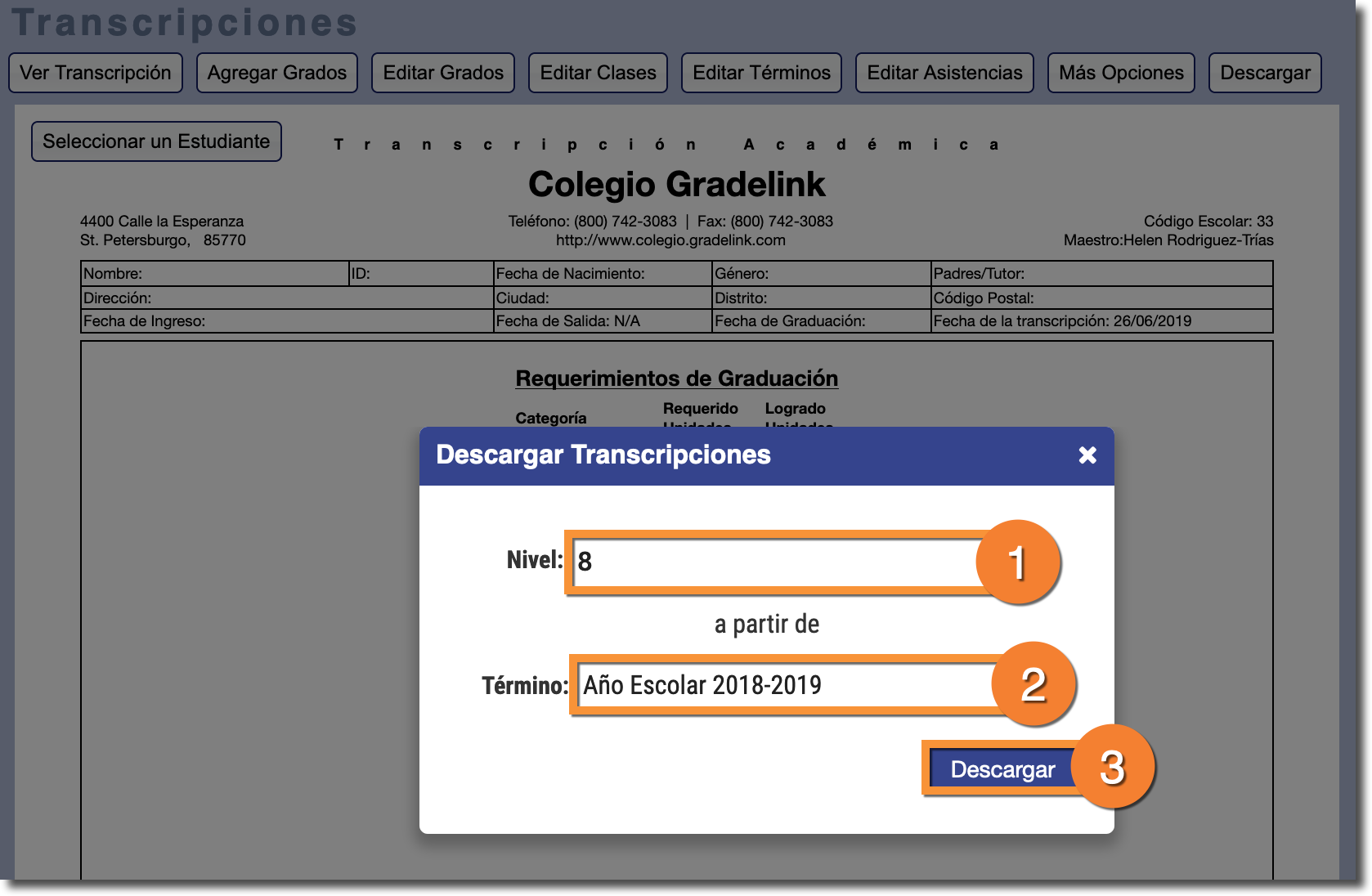 - Seleccione el nivel de grado para el que desea generar las transcripciones