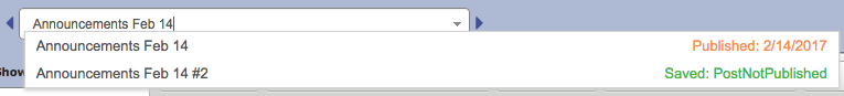 The arrows on the left and right will navigate through older and newer posts, respectively. In addition, the Post title field also functions as a dropdown menu that lists all Saved and Published Posts.
