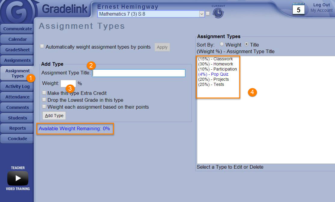 1. From a Teacher account, click on the Assignment Types tab