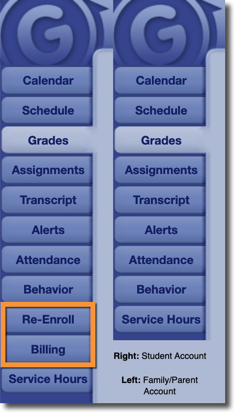 First, as you can see in the example above, the Family/Parent Account has access to tabs for Enrollment/Re-enrollment as well as Online Billing, while the Student Account does not.