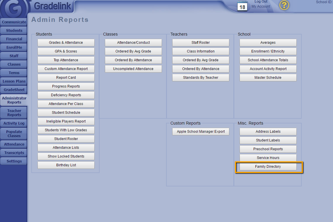 Gradelink's Family Directory report is under the Administrator Reports tab.