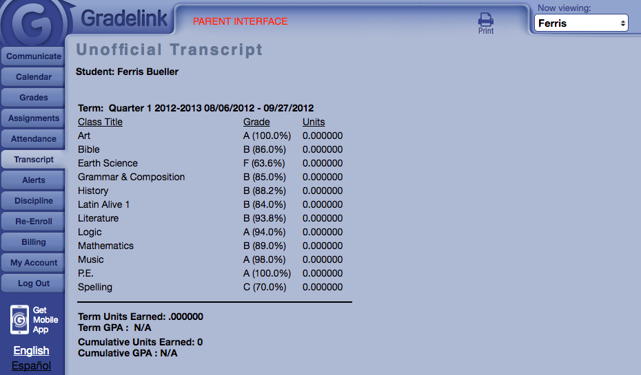 For example, it may be necessary to print an unofficial transcript for the student after they've graduated from the school. By keeping their account visible on the Family/Parent interface, their data can quickly and easily be accessed without having to ask school staff for help. Below is an image of what a parent can see for one of their inactive or graduated students.