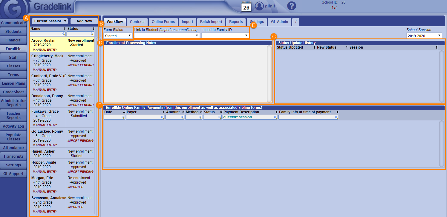 A. Applications List - Displays all the applications the school has received or that parents have started and are currently working through. The list of applications can be sorted by Session using the drop-down menu at the top of the list (where you can also view applications submitted in past academic years) or by Name and Status using the search fields located above the list of applications. In addition to noting whether the application is for a New Enrollment or a Re-enrollment, the list also notes the current status of the application as well as whether or not the information in an application has been imported into the Students tab of Gradelink.